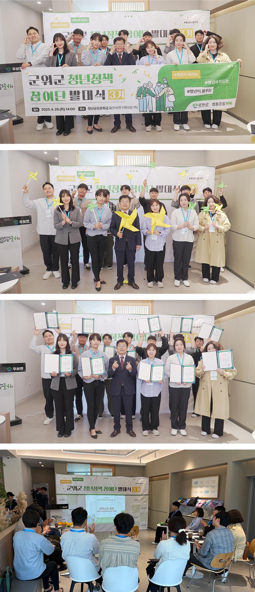 김진열 군위군수는 “앞으로 청년정책참여단이 군위 청년들의 역량을 키우고 군위의 변화를 이끌어가 다양한 사회문제 해결방안을 찾는데 능동적이고 적극적인 활동을 하게 될 것으로 기대한다“고 말했다.